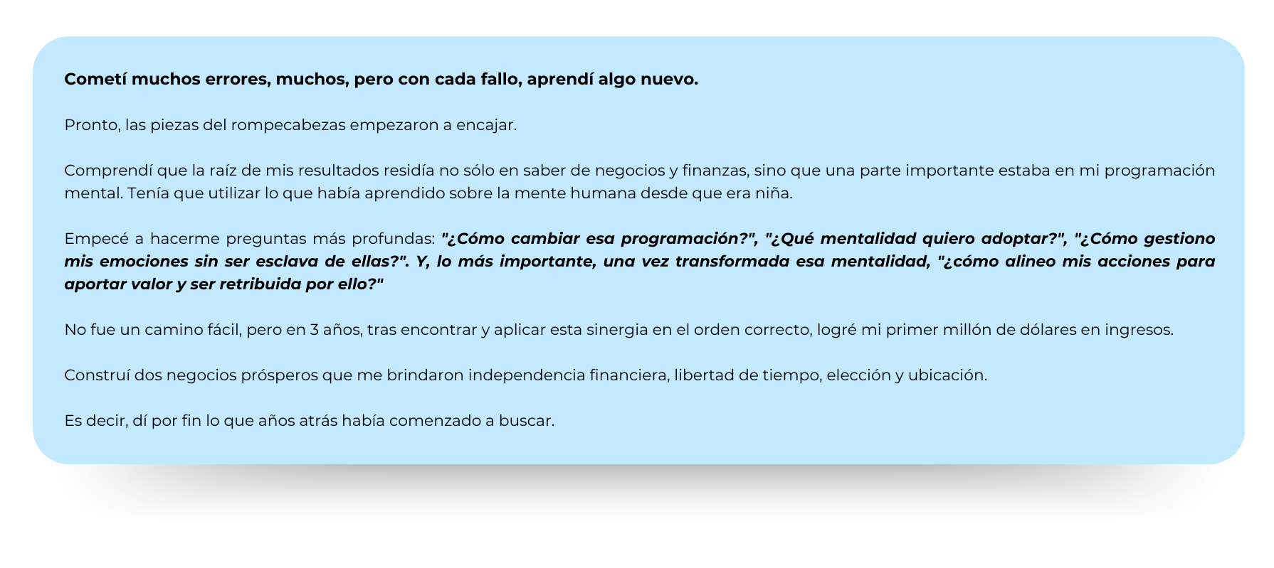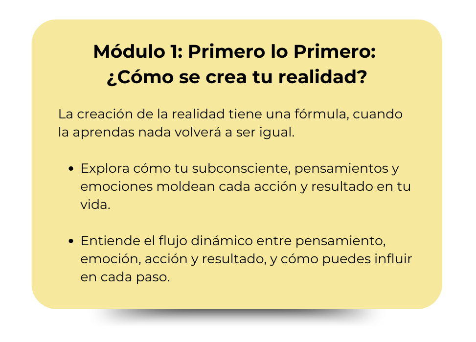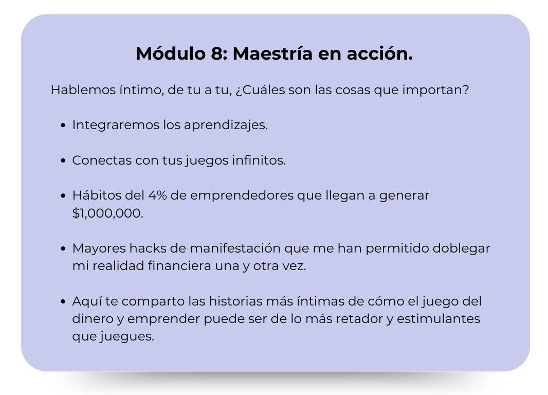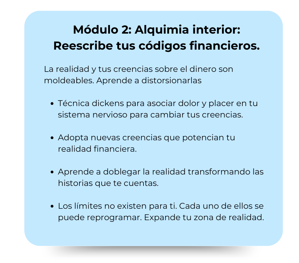 El conocimiento que a mí me costó descubrir años y mucha prueba y error, tú lo tienes ya listo y empaquetado para poder comenzar a cambiar tu realidad financiera en apenas dos meses.